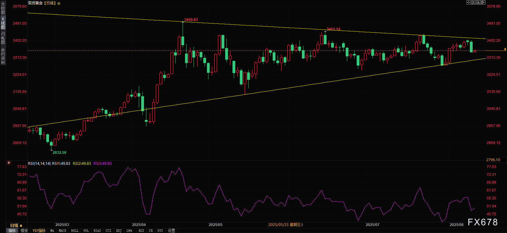 FXTM外汇官网APP讯——金价在周一(8月11日)震荡走低,跌幅超过1%,因乌克兰冲突出现缓和迹象削弱了避险买盘。白银价格同样疲软。此次回调发生在上周五剧烈波动之后——当日关税政策混乱推动期货价格创出新高后转跌,但现货黄金始终徘徊在3400美元关口附近,该价位如今已成为周二(8月12日)美国消费者价格指数(CPI)数据公布前的关键阻力位。尽管上周涨幅已基本回吐,但由于市场仍普遍预期美联储今年将多次降息,我们目前尚不能断言黄金进入看跌周期,具体判断还需要进一步的技术支持。