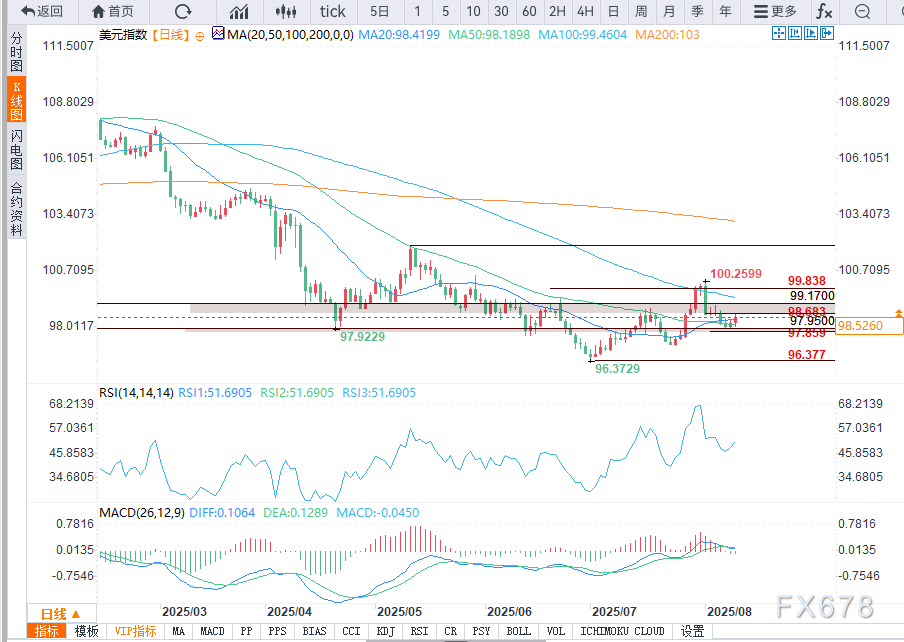 目前,市场正将98.683视为关键枢纽位。若美元能干净利落地突破这一水平,有望向99.17–99.83附近的强阻力区间发起冲击。