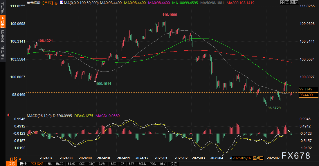 FXTM外汇官网APP讯——周一(8月11日),全球金融市场在关税言论、俄乌局势持续发酵以及美联储货币政策预期调整的背景下,呈现出复杂而微妙的波动。美元指数最新报98.4570,日内小幅上涨0.21%,显示市场在多重风险事件前保持谨慎。美债市场方面,10年期美债收益率最新报4.27%,较前一周略有回落,但长端收益率受关税引发的通胀预期及债务供应压力影响,整体仍维持高位。市场关注焦点集中在即将发布的美国7月CPI数据、俄乌局势相关会谈,以及美联储降息路径的不确定性。本文将结合基本面与技术面,深入分析美债与美元市场的联动性,并展望未来趋势。