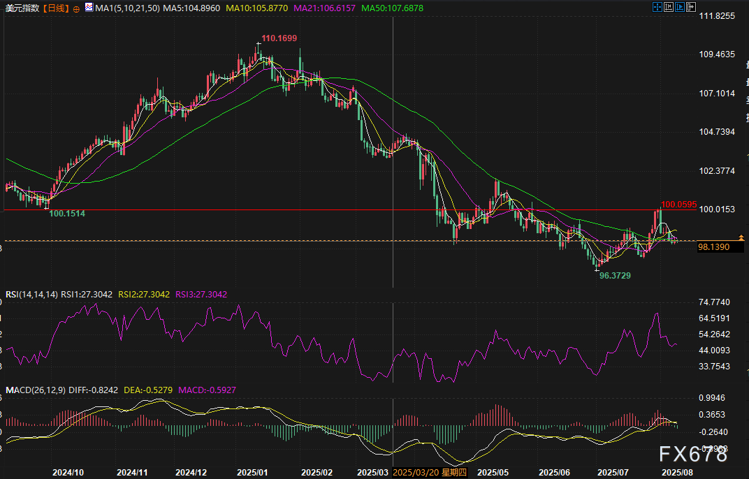 FXTM外汇官网APP讯——周一(8月11日),亚欧时段美元指数微跌0.09%,价格运行在10、20、50日均线下方,中期走势受到压制,目前交投于98.14,处于100整数关口下方。美元指数的波动始终与市场对美元资产吸引力的评估紧密相连,同时美元指数正面临多重来自政策预期和经济数据,以及市场情绪的影响。