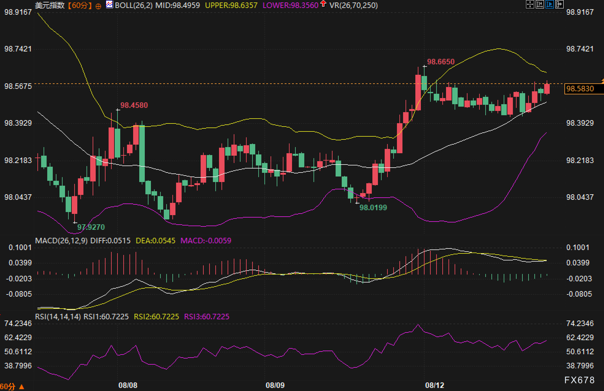从60分钟图表观察,美元指数当前运行在98.4580至98.6650的相对狭窄区间内,呈现典型的横盘整理形态。布林带指标显示汇价在中轨附近震荡,布林带收敛态势明显,暗示市场正处于方向性选择的关键节点。上方阻力位集中在99一线,该位置恰好对应前期高点,构成重要的技术阻力。下方支撑则位于98.0199附近,该水平与前期低点97.9270形成双重支撑格局。
