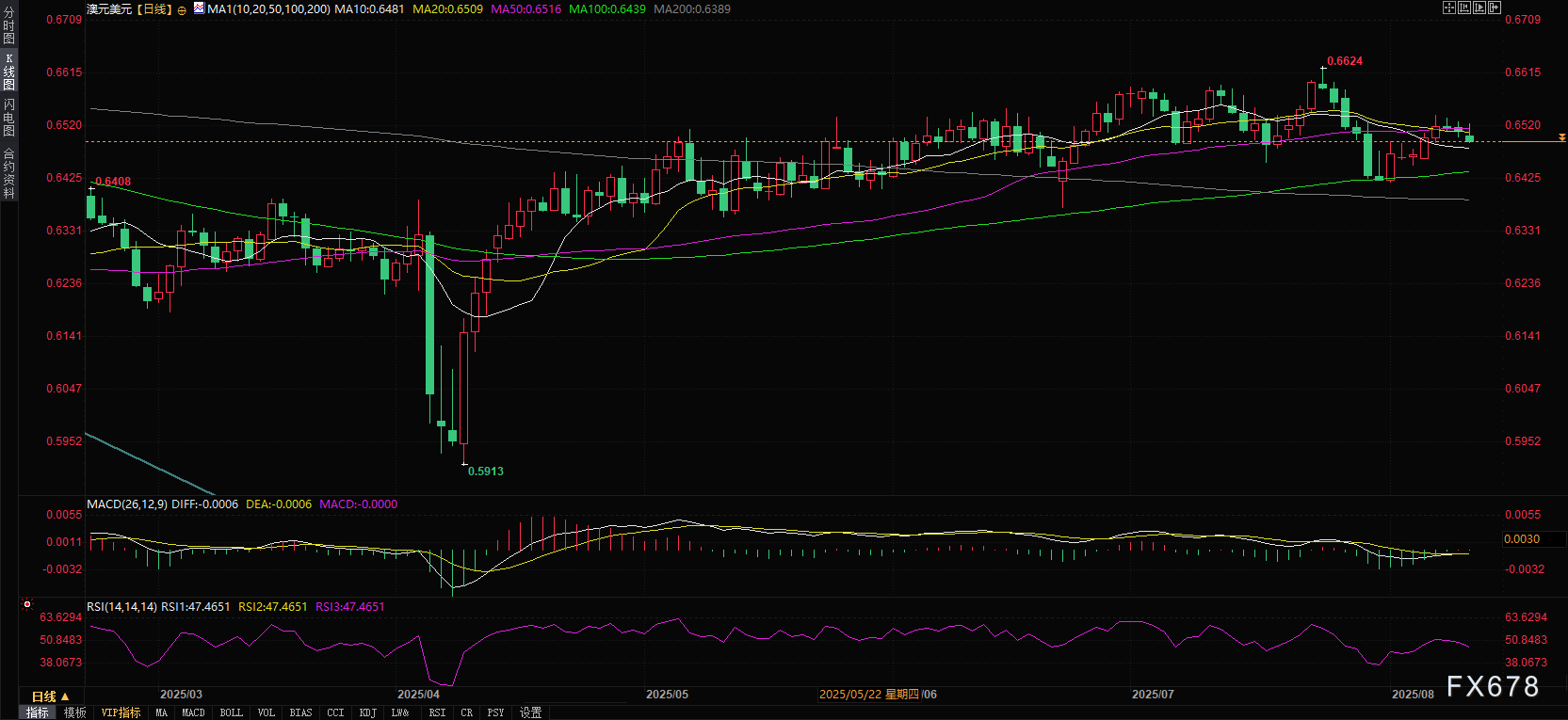 澳元兑美元汇率现报0.6500附近,在两大关键事件影响下保持稳定:中美关税最后期限延长90天,以及市场对澳洲联储降息的预期。贸易紧张局势缓和提振了澳元等风险敏感货币,而交易员正等待澳洲联储的政策指引。