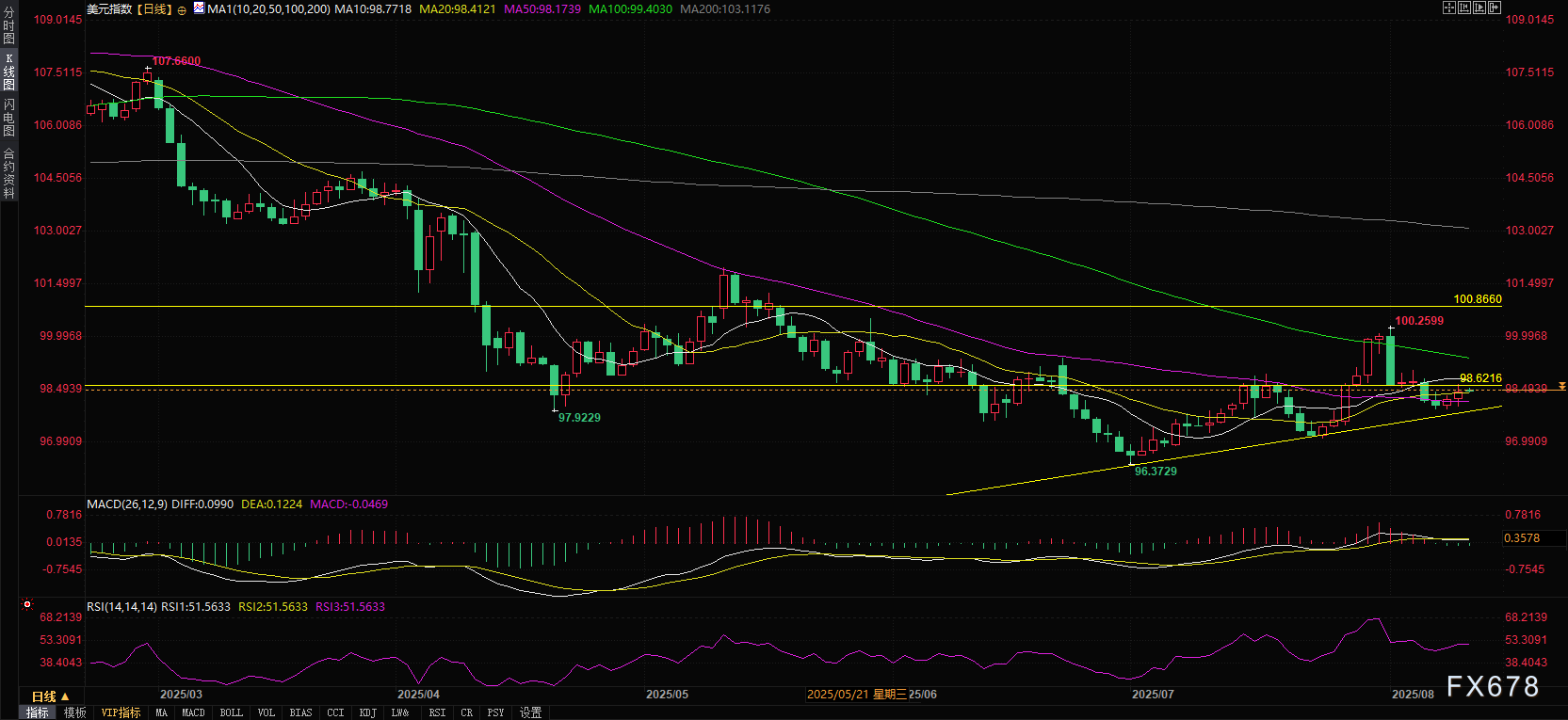 美元指数持稳于98.50水平附近,市场在等待今日关键的美国CPI通胀数据之际,美元涨幅抵消了上周的跌幅。美元局部走强,尤其兑日元,反映出在9月降息预期升温背景下市场的谨慎布局。